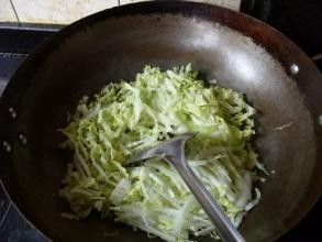 放入白菜翻炒,再放入酱油、精盐,调好口味,继续翻炒。