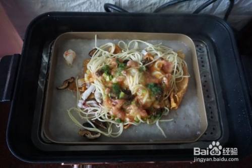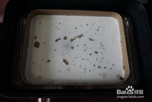 小烤盘里刷上油,倒入2大勺肠粉浆,将烤盘放入烧开水的锅里,盖上锅盖烧至肠粉凝固