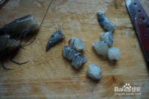 虎头虾去虾线,取出虾肉,再用小刀切成小段