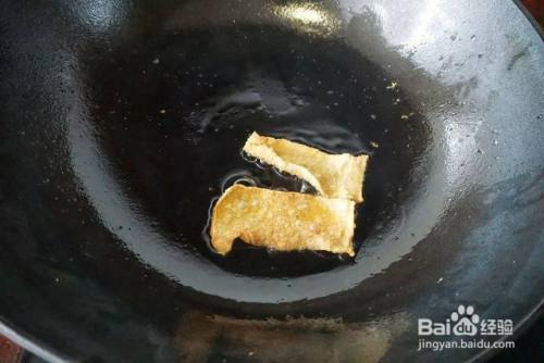 锅里热油后放入撕成小片的腐皮炸至表面金黄色