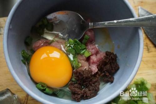鸡蛋磕入碗中,加入葱花、肉末和菜脯粒搅拌均匀
