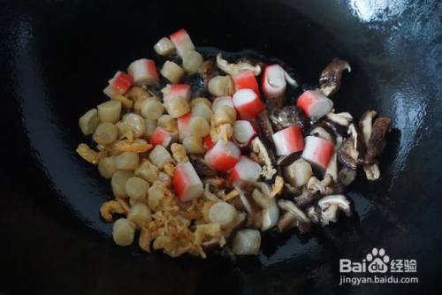 锅里热油后放入泡发好的虾仁、撕碎的香菇、切小段的蟹味棒和切小片的香菇炒出香味,盛出备用