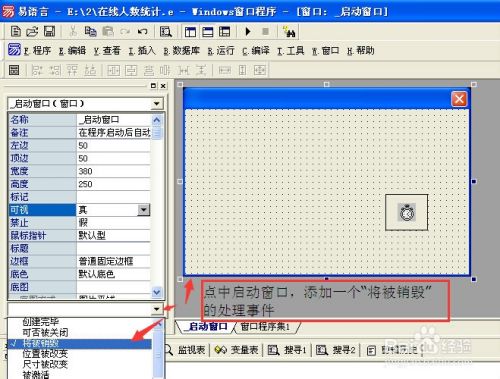 回到窗口界面,点击倒三角,添加一个处理事件的子程序,“__启动窗口_将被销毁”。