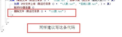 判断 (连接FTP服务器 (“FTP地址”, “FTP用户名”, “ftp密码”, , ) = 真) .如果 (FTP文件下载 (“在线人数.txt”, 取运行目录 () + “\人数.txt”, ) = 真) 在线人数 = 到整数 (到文本 (读入文件 (取运行目录 () + “\人数.txt”))) + 1 .如果 (写到文件 (取运行目录 () + “\人数.txt”, 到字节集 (到文本 (在线人数))) = 真) .如果 (FTP文件上传 (取运行目录 () + “\人数.txt”, “在线人数.txt”, ) = 真) 时钟1.时钟周期 = 0