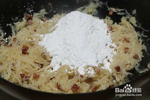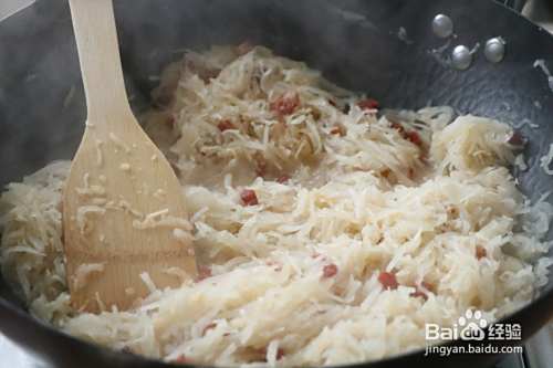 6、把萝卜丝加进去,翻炒至出水变软。再来调味:1勺半盐、3克胡椒粉、1勺蚝油,翻炒均匀,然后放一旁晾凉;