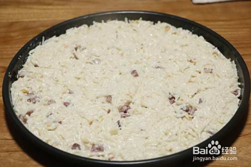 9、准备一些平底模具,以前刷一层食用油,再把拌好的萝卜丝铺在模具里面,整理平整,最后用锅铲按压平整,隔水上锅蒸大约25分钟左右;