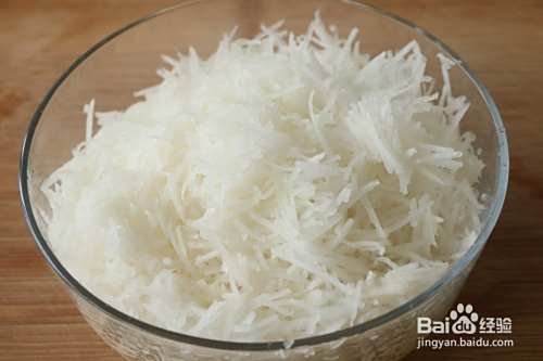1、准备2根大萝卜,萝卜先去皮,然后擦成稍微细一点的丝,全部擦完放在一旁备用;