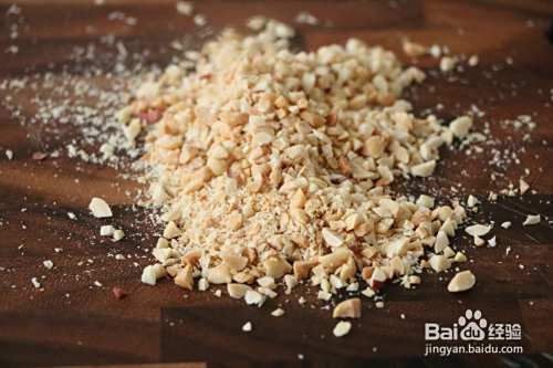 4、花生米炒熟或是烤熟,把皮搓掉,再用刀切碎一点;