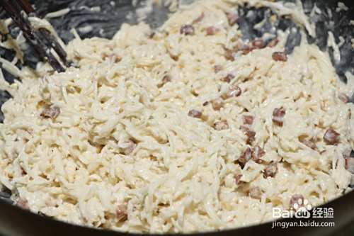 7、再放凉的胡萝卜丝里分次少量的加入粘米粉,拌均匀,每次加之前都要拌均匀;