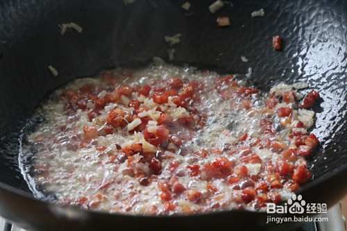 5、锅中加入食用油,油热之后把腊肠加进去炒出油脂,再把干贝丝也加进去炒出香味,接着加入1勺蚝油调味,翻炒均匀;