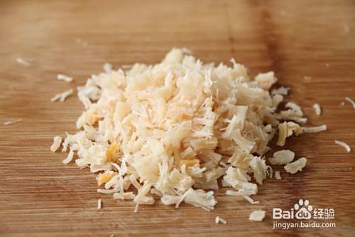 3、准备80克的干贝,清水浸泡30分钟左右;浸泡好的干贝用刀拍碎,然后撕成丝装在碗中;