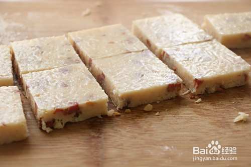 12、我们的萝卜糕就做好了,萝卜的清甜搭配糯米粉的软糯,软而不烂,最后还有萝卜丝的嚼劲,腊肠和干贝的鲜美,这大概是我吃过萝卜最好吃的做法了。吃不完的可以冷藏保存,第二天煎一煎就可以吃了。