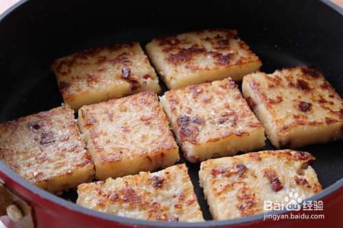 11、平底锅刷一层食用油,油热之后把萝卜糕放进去,中小火煎至两面金黄色就可以吃了;