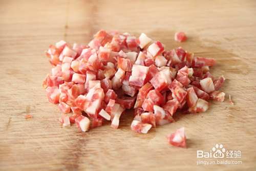 2、准备一根腊肠,先对半切开,然后切成小丁,装在碗中备用;