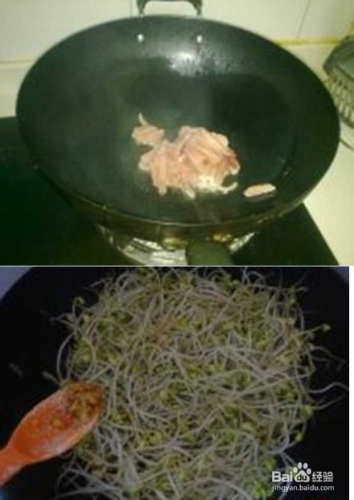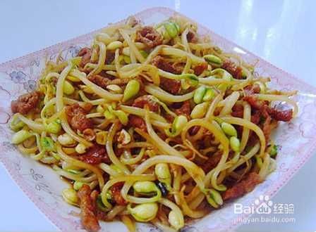 勺内加底油烧热,放入肉丝煽炒至肉丝变色。加入姜丝、葱丝、黄豆芽煽炒,烹入料酒,添入鲜汤,加入精盐调好口味。