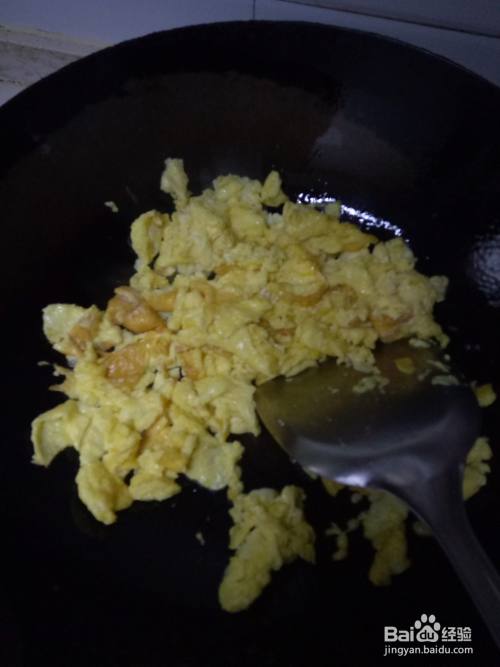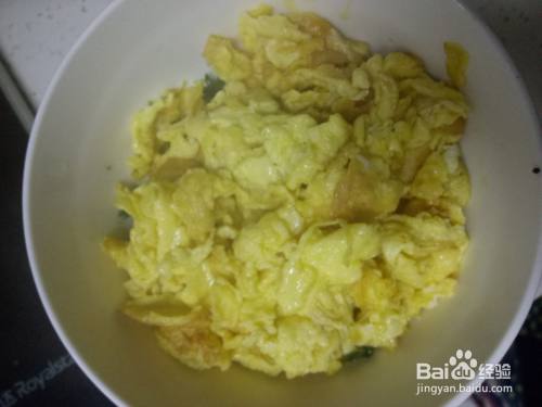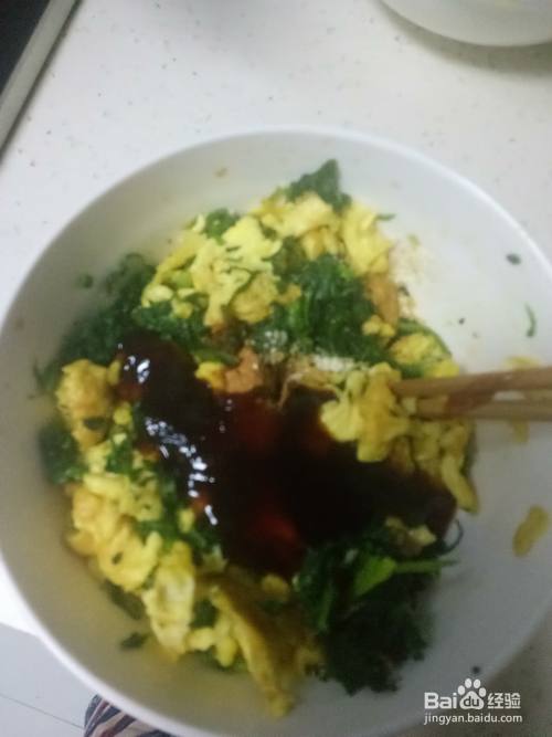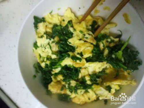 炒锅预热后加入适量的油,油温升起后倒入鸡蛋液,翻炒成块后盛入装地菜的碗中,搅拌一下后调入适量的盐、南德、生抽、耗油、香油,蒜苗搅拌均匀。