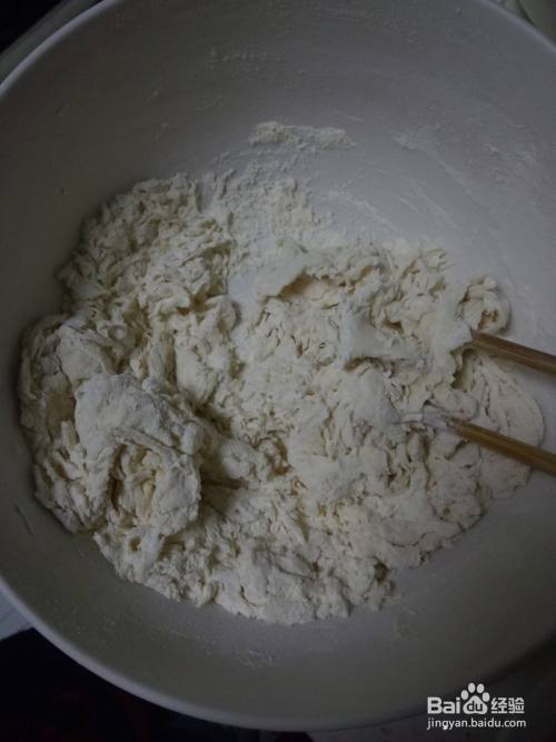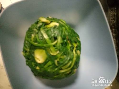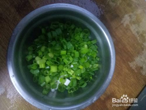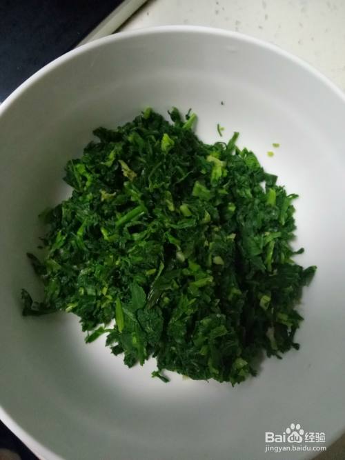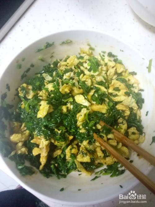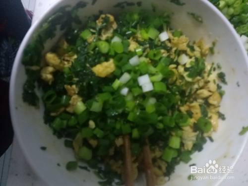 一个大碗中加入适量的面粉、盐、清水搅拌成面絮后揉成光滑的面团。面团揉好后盖上保鲜膜醒面15分钟左右。之前冷冻保存的地菜解冻动后剁碎,装入碗中。鸡蛋洗净蛋壳后打入碗中,搅拌均匀。蒜苗洗净后切碎,备用。