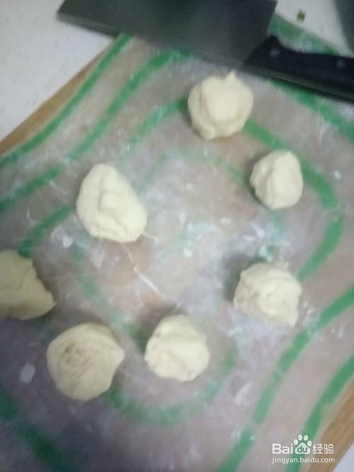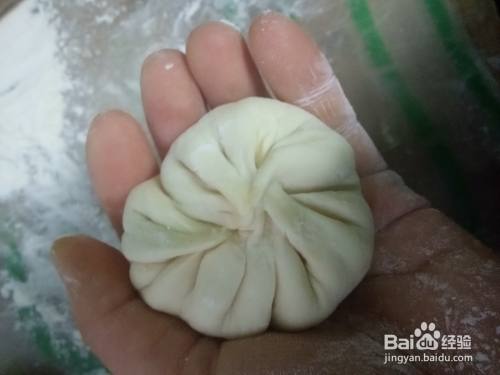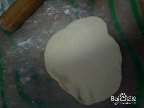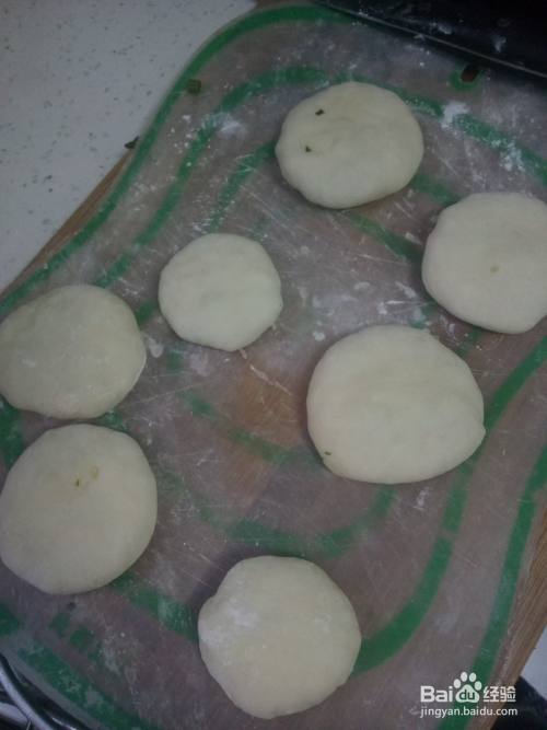 面醒好后再次揉成光滑的面团,分成大小一致的小剂子。取一个小剂子,擀压成薄饼后放入馅料,包起来。包好后反着放在面板上,稍微按压一下成圆饼。