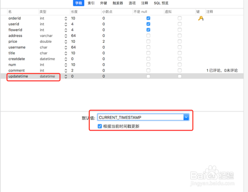 自动更新时间的字段和创建时间字段唯一不同,就是下面要勾选“根据当前时间戳更新”,默认值还是一样的