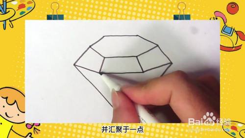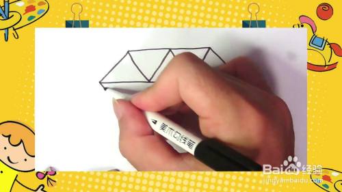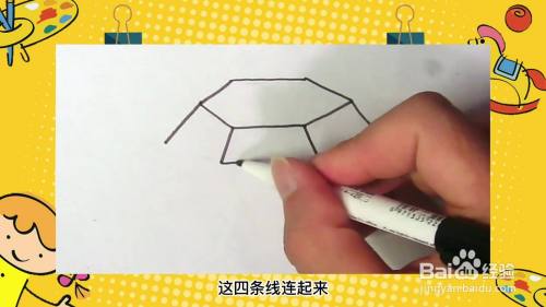 首先画出一个较扁的六边形,在下面四个角分别拉出一条线,这四条线连起来。