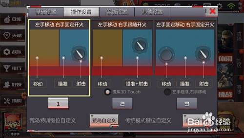 操作设置,这个就是我们在玩荒岛特训游戏的时候,手要操作的一个模式了。这里有三种,我们可以选择。