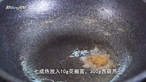 5炒西葫芦:锅中重新放10毫升油,7成热,放入10克花椒面、300克西葫芦翻炒至8成熟时,放入虾仁煸炒,再放入10克盐、10克蚝油,煸炒均匀即可。