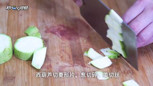 2准备材料:西葫芦切菱形片,葱切碎,姜切丝。