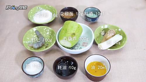 1食材展示:虾仁100克、西葫芦300克、葱10克及所需食材。