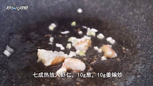 4炒虾仁:锅中倒入10毫升油,7成热放入虾仁,加10克葱、10克姜煸炒,虾仁变色捞出。