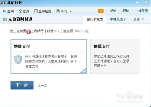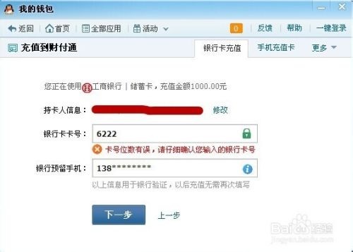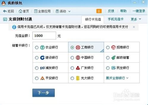 点击”银行卡充值“,输入充值金额,点击”下一步“如图