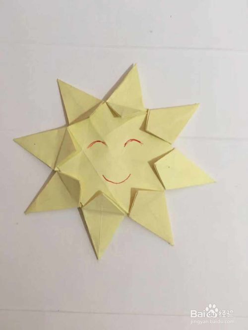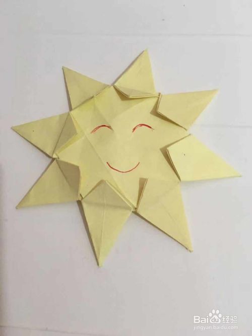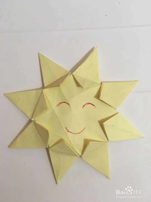 第六步 折叠完之后 再以同样的方法步骤 再用另一张红色彩纸折叠一个同样的 然后把两个扣在一起 然后再整理海英摸一下 用五晃红色水笔画上弯弯的眼睛和翘翘的嘴巴 一个美丽的太阳公公就折叠完成了