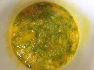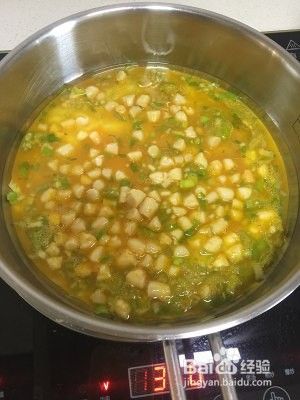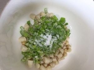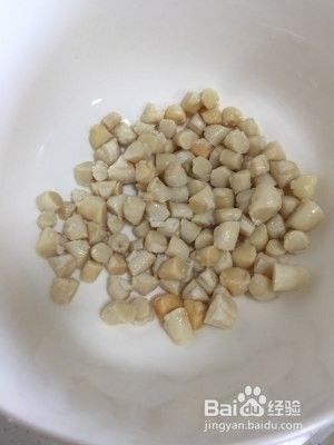 扇贝丁洗净。开水烫一下(烫的时候要开水下锅,锅里放2片姜,2个大葱段,去腥)