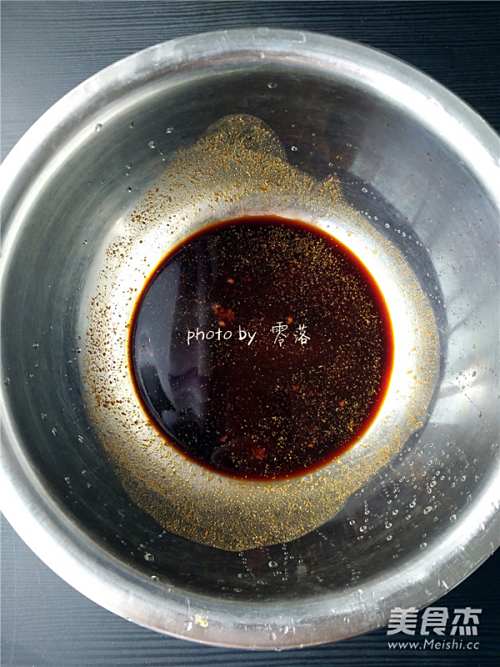 2取一个容器,调入适量咖喱粉,胡椒粉,孜然粉,生抽,老抽,料酒,搅拌均匀;
