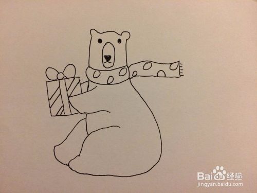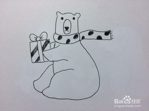 最后画出盒子上的花纹,还有围巾的圆圈花纹。漂亮的北极熊就画好了;可以填上自己喜欢的颜色哦。