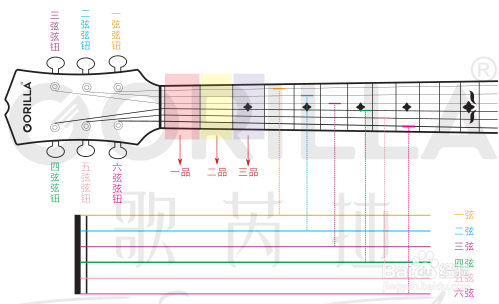 吉他的谱子叫六线谱,谱子上的六根线对应吉他的六根弦,六线谱从上往下数分别是吉他的1、2、3、4、5、6弦,琴头到音孔,每个小格子都叫做“品”,按顺序数分别是一品、二品、三品……