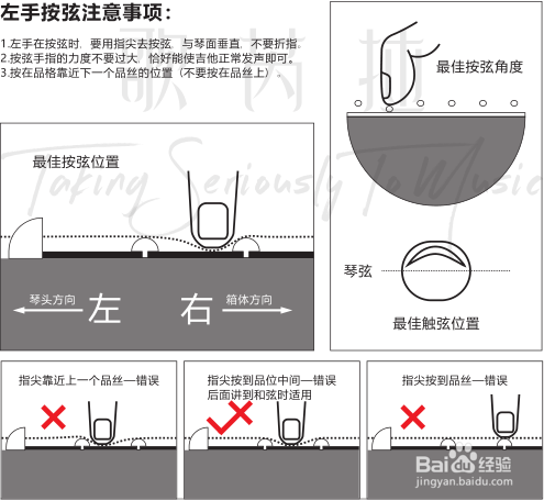 左手在按弦的时候应该用指尖按弦,与琴面垂直,按在靠品丝的地方,但注意不要按到品丝。
