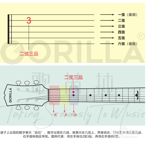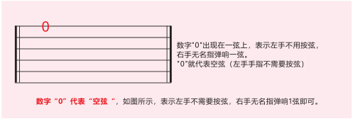 还有一种情况是弦上的数字是“0”,这其实是表示“空弦”,意思是左手不用按品,右手拨动数字所在的弦就好,另外还有一点需要注意的就是,我们在读弦的时候一定是先读弦再读品,例如二弦三品、三弦四品这样读。