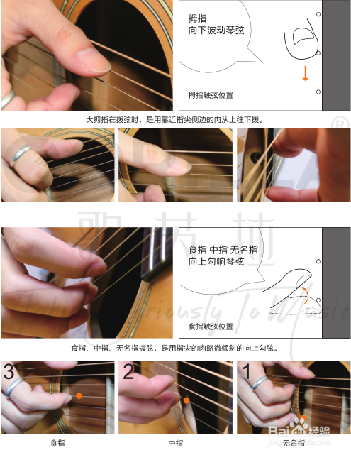 首先要说明一下手指分工的问题,弹奏吉他是用左手按品,右手拨弦,不过有新手会问:“我们右手只有五根手指,但是吉他琴弦有六根弦,这要怎么按弦呢?”这就有明确的分工了,右手大拇指负责拨动6、5、4三根弦,食指拨动三根、无名指拨动一根。