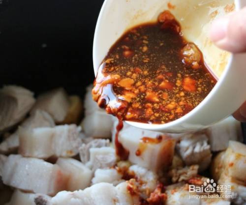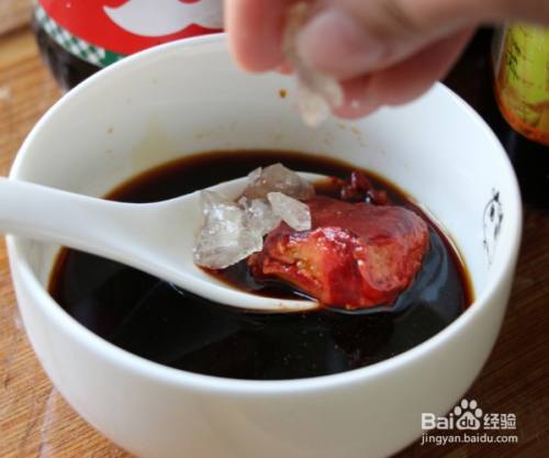 提前调好料汁,碗中加入生抽、老抽、料酒、冰糖、红腐乳汁和1块红腐乳,将腐乳捣碎。