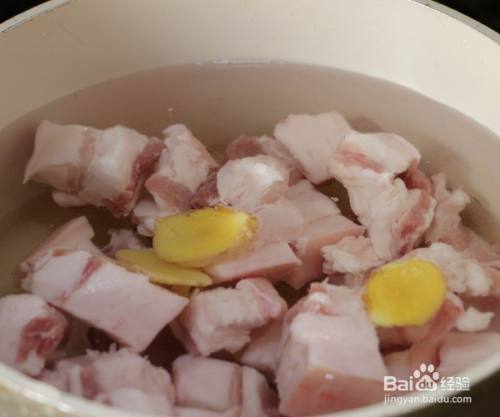 冷水锅中放入姜片和五花肉,加一勺料酒煮开,撇去浮沫,捞出沥水。