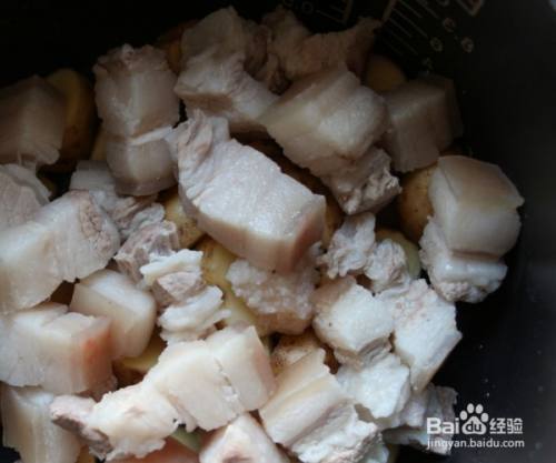 电饭锅底先铺上几片姜,然后铺上切块土豆,在土豆上铺上焯好的五花肉。