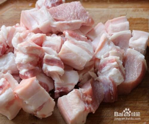 五花肉放清水中浸泡几十分钟,洗净切成小块。