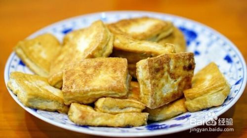 然后,我们把锅里倒入适量的花生油,烧热,将切好的豆干倒进去,炸至金黄,捞出来、成放在盘中。