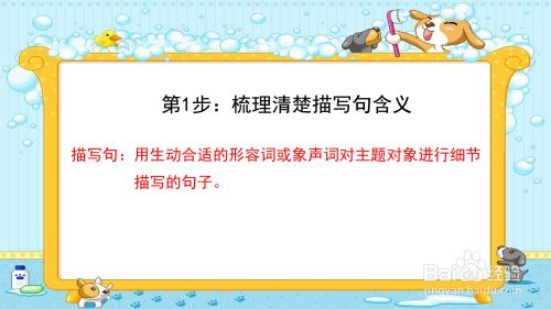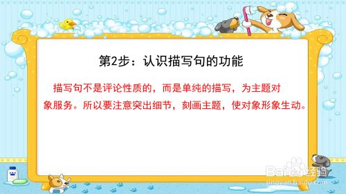 描写句不是评论性质的,而是单纯的描写。注意突出细节,刻画主题,使主题对象形象生动。