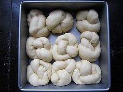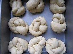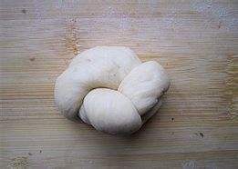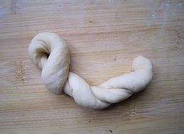 每一份搓成长条,对折,然后扭成结,把头塞到圆圈内。