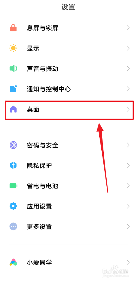 在设置页面通过滑屏找到【桌面】并点击所在行。