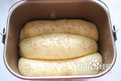 用面包机的酸奶程序进行第二次发酵,时间为50分钟左右,最后发酵至接近面包桶六七分满,在表面刷上蛋液,撒上芝麻。