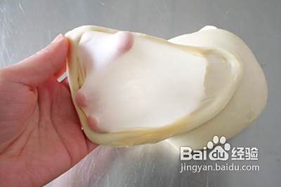 第三个“和面”程序结束,吐司的面团也揉好了,取出来检验一下,可以撑开不容易破裂的大片薄膜。