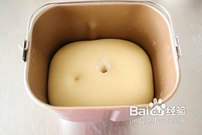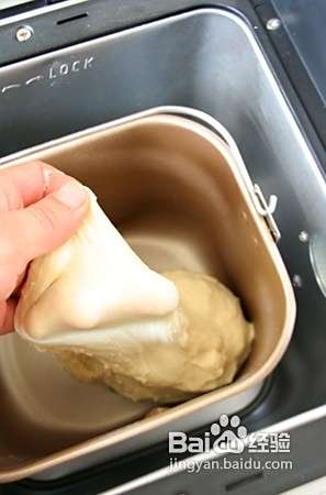 揉面一定要到位。一定要选择3个和面程序,即需要60钟的和面时间,这样才能将面团揉到完全扩展阶段,和步骤1那样,拉出薄薄的膜最好,这样做出来的面包比较松软,口感比较好。