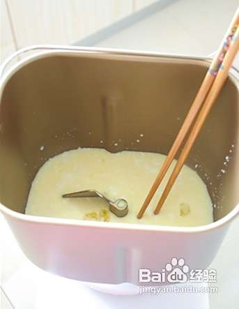 先将面包桶取出,搅拌棒安上,倒入牛奶,蛋液,淡奶油、糖和盐,先用筷子轻轻搅匀.(注意:筷子头不要用力划桶底及桶壁,以保护不粘的内壁)